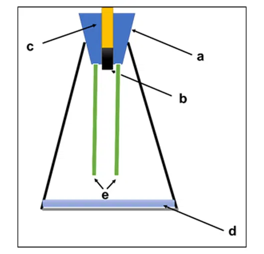 Fig 1: K-Test experimental setup a) Rubber bung, b) Test Metal sample, c) Glass tube with frozen water d) Glycerin water mixture e) VCI-OS film