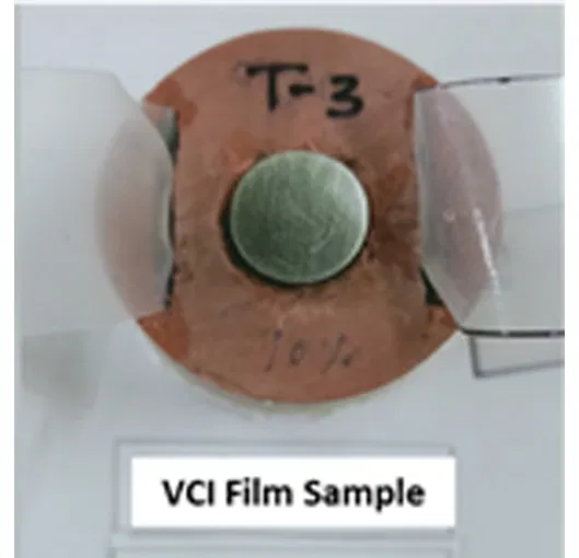 VCI additive preparation: The additive was prepared by mixing primary amines and some proprietary additives, was stirred at 600 rpm at room temperature. The 10% active based LLDPE masterbatch (MB) was extruded in Steer make twin-screw extruder (Alpha 18) with 44 L/D ratio at 130-160°C temperature. The LDPE (24FS 040 by Reliance industries) film was processed at 8-10% VCI MB concentration by blown film extruder to form a 100 µm thickness. The VCI film was tightly rolled and packed in an aluminum foil bag to avoid vaporization of VCI active from the film. After a conditioning period of 24 hours, the film was tested as per the standard efficacy testing.