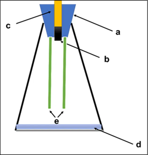 Fig 1: K-Test experimental setup a) Rubber bung, b) Test Metal sample, c) Glass tube with frozen water d) Glycerin water mixture e) VCI-OS film