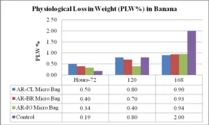 - Anti-Ripening Halogen Micro Bags – As seen in Fig-5, PLW (%) of Bananas increased during storage but was found to be the lowest (0.90 %) when packed in AR-CL Micro Bags as against Control Bags (2.00 %) at the end of the storage period of 7 days.Fig-5 Physiological Weight
