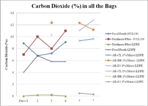 - Carbon Dioxide Concentration: % CO2 content was measured in each test bag over a period of 7 days.
