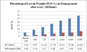 As seen in Fig-3, at the end of 65 days, Freshness Plus showed only 6.82 % PLW as compared to 29.04 for Control.