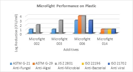 Fig 4 depicts the performance of various MicroFight grades offered by NICHEM for imparting anti-microbial protection on the surface of polymers. Today, we export a sizable quantity of this product worldwide.