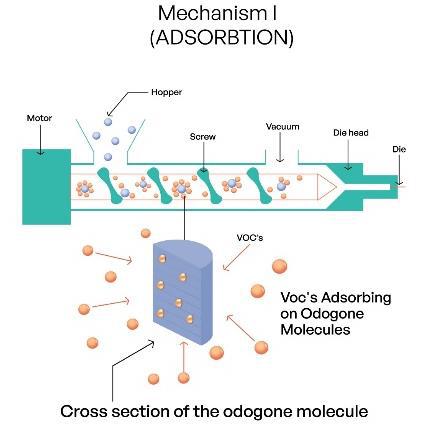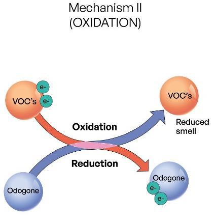During recycling, while some VOCs get adsorbed, some of them get oxidised by losing electrons to the active molecules of OdoGone present in the hot molten mixture. The oxidation of VOCs reduces the mal-odor of the molten mixture. In this process, OdoGone gets reduced by gaining the electrons from the VOCs as depicted in Fig 2. Unlike physical adhesion of VOCs in Adsorption mechanism, Oxidation process chemically removes the mal-odors from the polymer mix.
